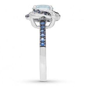 A mesmerizing display of color makes this engagement ring a truly stunning symbol of love. Ribbons of lab-created blue sapphires and shimmering round diamonds swirl outward from the aquamarine center, while more lab-created blue sapphires decorate the band. The 14K white gold ring has a total diamond weight of 1/15 carat.